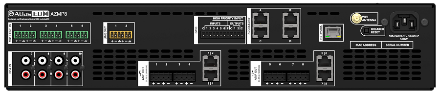 The AZMP8 utilizes amplifier power sharing technology that allows for efficient use of available power and avoiding system overdesign due to traditional amplifier power ratings. The AZMP8 can produce 1200W of total power, with each output channel being software assignable anywhere between 5-600W.