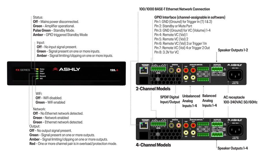 Ashly’s FX comes in two configurations: 1/2 Rack Units (RU) for fitting into those tight spaces where other high-powered amps won’t go. And for when you need the “big guns”, the 2 RU FX 500.2 & FX500.4 deliver power enough for even the largest speakers in your system (like those big subs). All FX models are lightweight for their power levels (the 2,000W FX 500.4 is only 16.5 lbs!). FX does more, in a smarter, more comprehensive package.