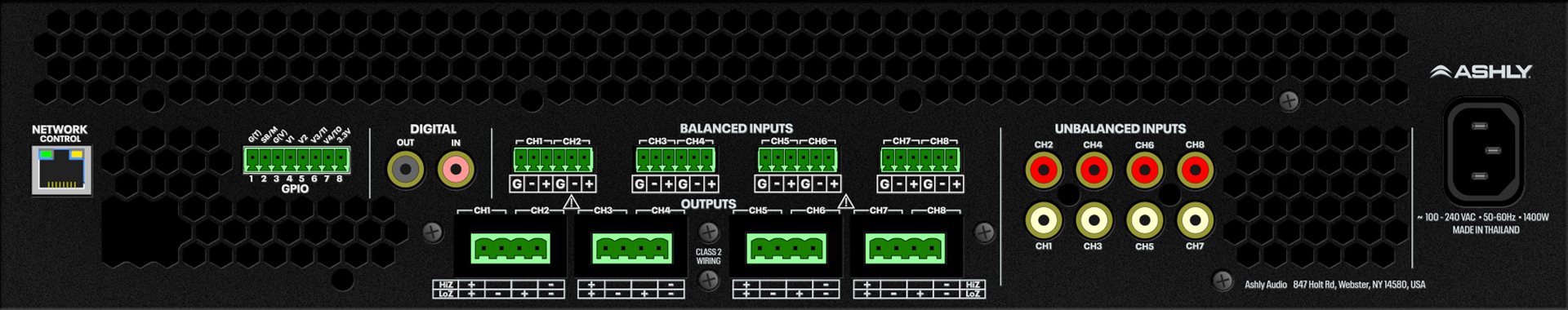 An added feature is the ability to create, save & load speaker presets to accommodate virtually any loudspeaker (including Ashly AW, IS & SP models, of course). These can be loaded independently per channel, so different speakers may be used for different zones, or satellites and subs may be used for a bar or auditorium.