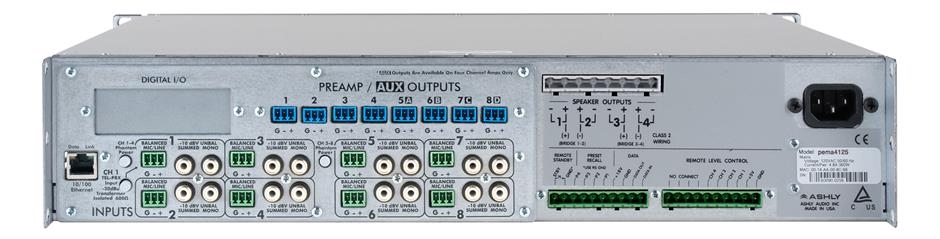 Die Class D Media Endstufe pêma4125 (Protea Equipped Media Amplifier) ist eine neuartige Endstufe mit 8 Input Kanälen (8 x stereo Input mittels Cinch/8 x symmetrischer Input mittels Euroblockanschlüssen) inkl. Preamp Funktion, Matrixmöglichkeiten, automatischer Rückkoppelungsunterdrückung, Netzwerkfähig gemäss Standardprotokoll 10/100 von Ashly und vielen weiteren Features. Mit der Protea Software kann Sie leicht bedient und umprogrammiert werden. Sie ist mit 4 x 125 Watt an 4 Ohm ausgerüstet.